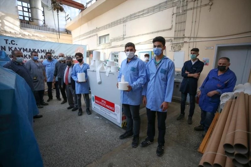 İskenderun Mesleki ve Teknik Anadolu Lisesi öğrencileri, Ar-Ge faaliyetleri kapsamında, N95 maske makinesi ve CNC fiber lazer kesim makinesinin ardından düşük maliyete kağıt havlu ve tuvalet kağıdı üretmek için çalışma yaptı.