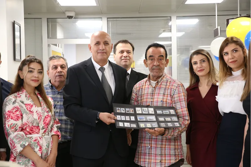 Hatay PTT Başmüdür Yardımcısı Nihat Gezer, Güler'e günün anısına pul albümü verdi.