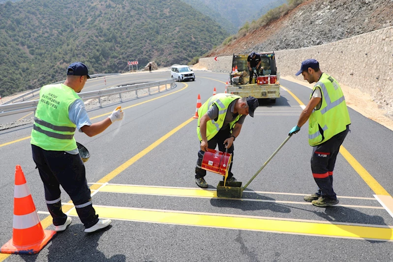 Büyükşehir Belediyesi ekiplerince, 29 kilometrelik yolda, çizgi boyası ile trafik uyarı ve yönlendirme levhaları montajı yapılıyor.