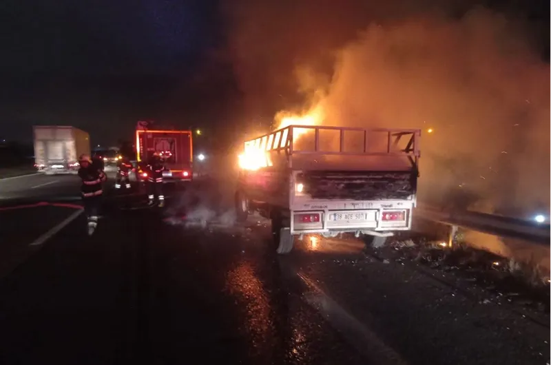 Payas-Dörtyol Otoyolu'nda seyir halindeki plastik malzemeler yüklü V.D. yönetimindeki pikapta, henüz belirlenemeyen nedenle yangın çıktı.