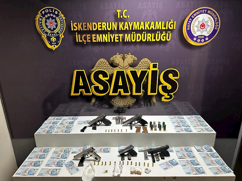 Adreste yapılan aramada, 5 ruhsatsız tabanca, 9 şarjör, 15 fişek, 15 uyuşturucu nitelikli hap, 15 gram metamfetamin ve 14 bin 650 lira ele geçirildi.