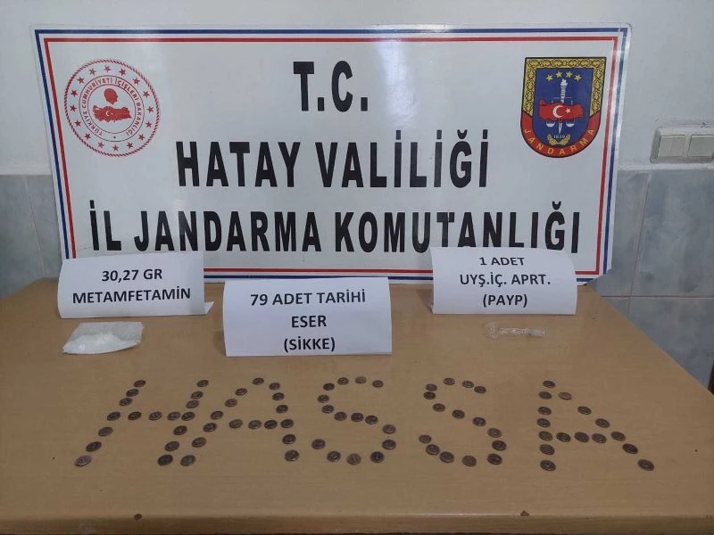 Kaçakçılıkla Mücadele Şube Müdürlüğü ile Hassa İlçe Jandarma Komutanlığı ve Jandarma Dedektifleri (JASAT) tarafından takibe alınan otomobil Akbez Mahallesi’nde durduruldu. Otomobilde yapılan aramada; 30.27 gram uyuşturucu madde olduğu değerlendirilen metamfetamin, 5 adet uyuşturucu hap, 2 adet Payp diye tabir edilen uyuşturucu madde içme aparatı ile 79 adet tarihi eser olduğu değerlendirilen obje ele geçirildi.