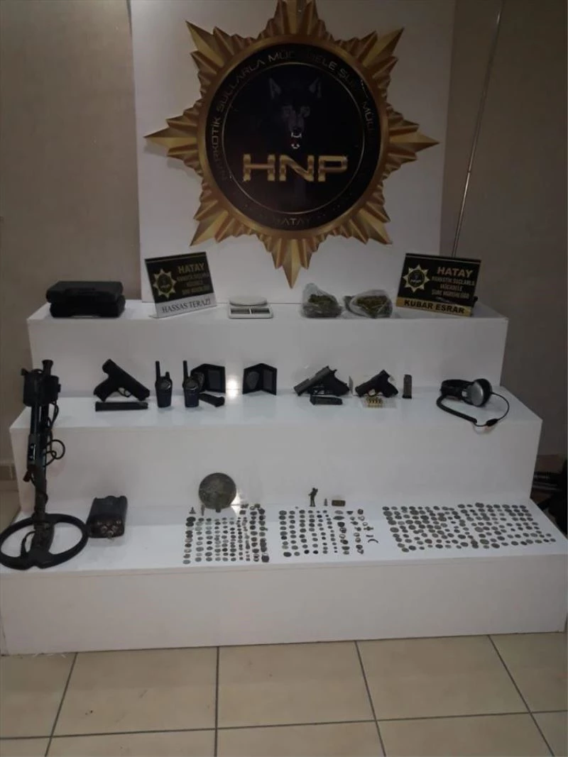Aramada, tarihi eser olduğu değerlendirilen farklı dönemlere ait 282 sikke, 41 yüzük, ok ve kolye ucu, 4 mühür, 18 taş obje, 2 kırık yüzük parçası, metal dedektör, 2 polis rozeti bulunan sahte cüzdan ve 2 amatör telsiz ile 80 gram esrar, hassas terazi, 2'si kurusıkı 3 tabanca, fişek, şarjör ele geçirildi.