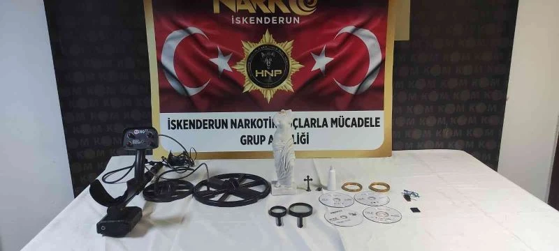 Hatay’ın İskenderun ilçesinde düzenlenen operasyonda 1 adet heykelcik, yüzük, haç figürü, 2 adet bilezik ve bazı materyaller ele geçirildi.