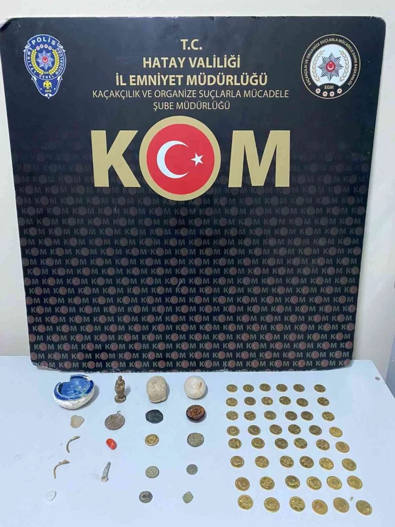Hatay İl Emniyet Müdürlüğü görevlileri tarihi eser kaçakçılığı suçu kapsamında çalışma gerçekleştirdi. Reyhanlı Yeni Mahallede bulunan bir ikamette yapılan aramada 55 adet sikke, 8 adet obje, 1 adet madalyon, 1 adet insan figürlü heykel, 1 adet gözyaşı şişesi ele geçirildi.