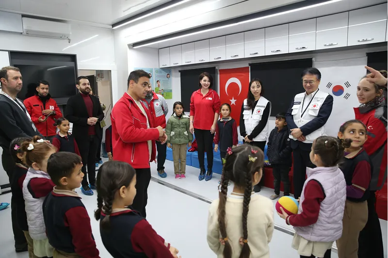 Türk Kızılay ve Kore Kızılhaçı yetkililerinden oluşan heyet de mobil tırı ziyaret ederek depremzede çocuklarla bir araya geldi.