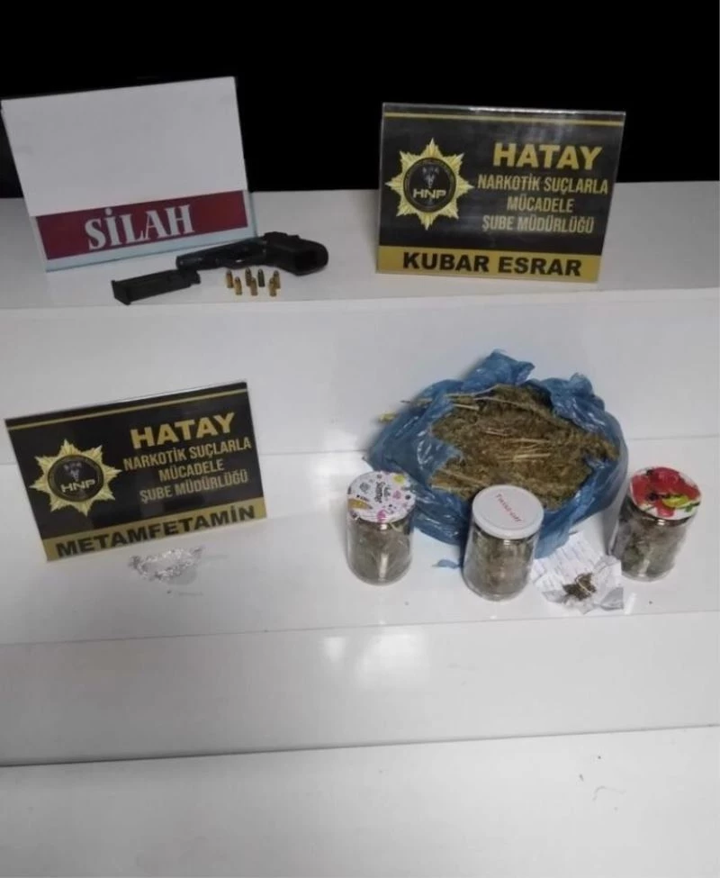 Şüphelilerin ikamet adreslerinde yapılan aramada, 1 kilo 400 gram esrar, 25 gram metamfetamin, 184 adet captagon hap, 1 adet ruhsatsız tabanca ve tabancaya ait 1 adet şarjör ile 7 adet dolu fişek, 2 adet ruhsatsız otomatik tüfek ve 10 adet dolu kartuş, 2 adet hassas terazi, 200 sahte dolar ele geçirildi.
