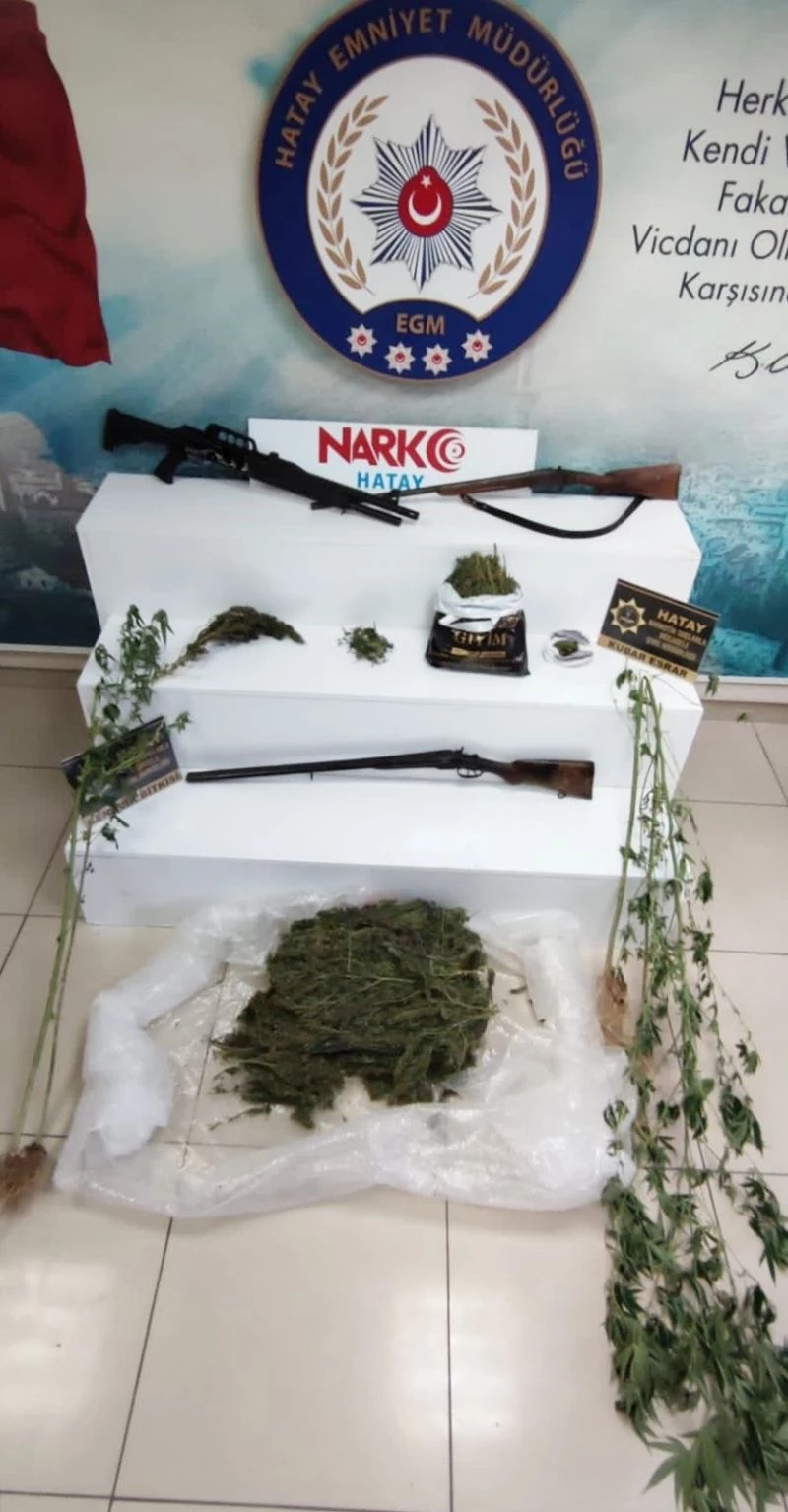 Hatay’ın Defne ilçesinde 1 kilo 674 gram kubar esrar, 21 adet hint kenevir bitkisi, 3 adet ruhsatsız av tüfeği ele geçirildi.