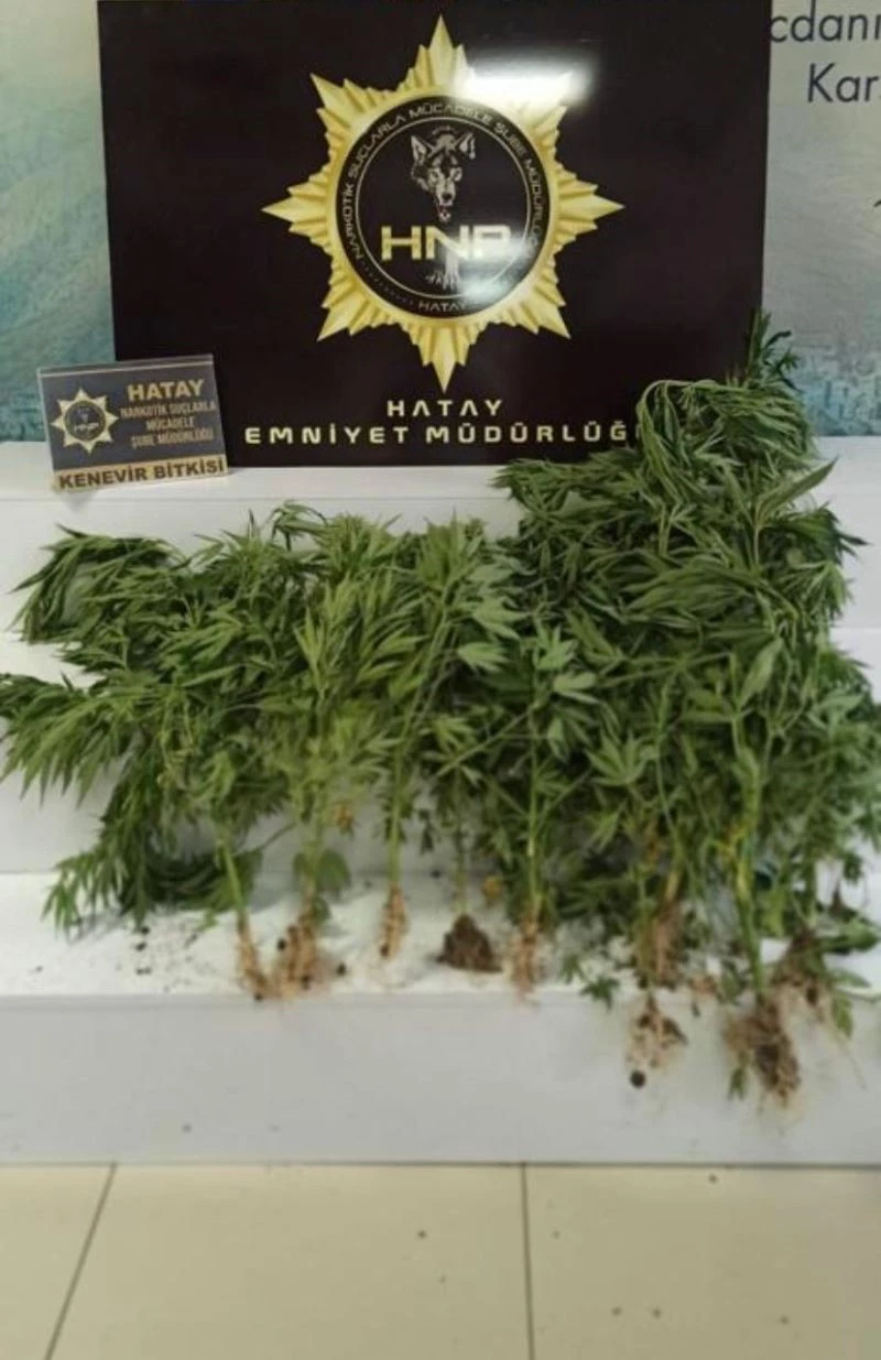 Antakya Ballıöz Mahallesi’nde bulunan bir ikamette yapılan aramada ise boyları 50 ile 160 cm arasında değişen 12 kök Hint keneviri ele geçirildi.