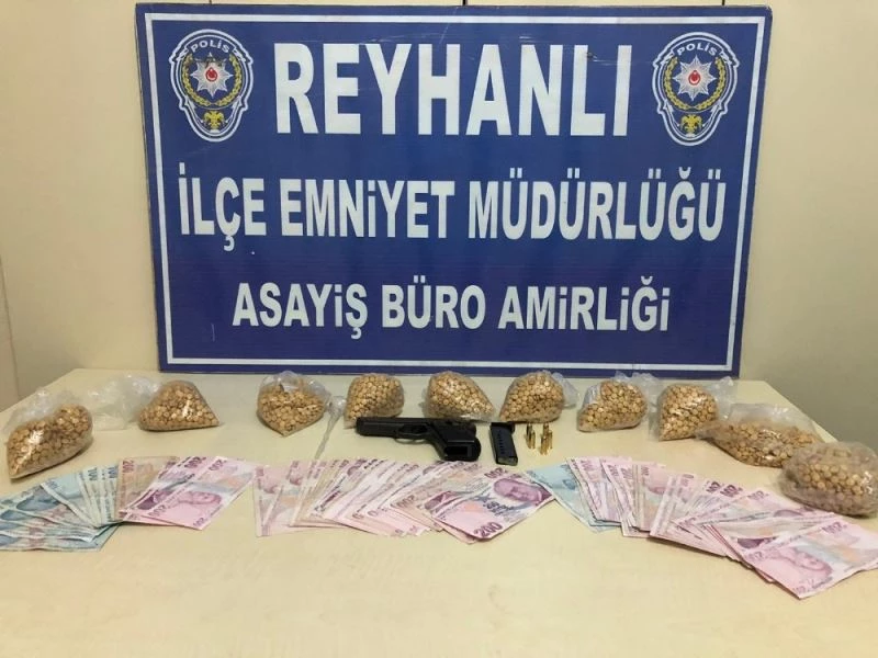 Alınan bilgiye göre, Hatay’ın Reyhanlı ilçesinde İlçe Emniyet Müdürlüğü Asayiş Büro ekipleri uyuşturucu madde satıcılarına yönelik yapılan çalışmalar kapsamında M.A.K. isimli şüphelinin evine operasyon düzenledi. Evde yapılan aramada 10 bin adet uyuşturucu hap, 12 bin 800 lira para, başkası adına düzenlenmiş 3 adet yabancı tanıtım belgesi, tabanca ve bu tabancaya takılı vaziyette şarjör ve 5 adet dolu fişek ele geçirildi.