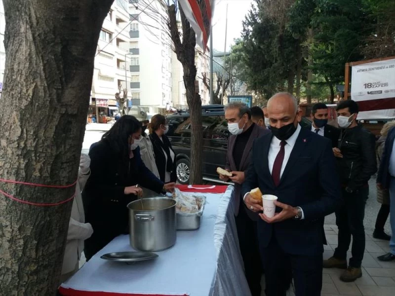 Antakya Öğretmenevi Müdürü Ömer Bilgin ve personeller tarafından öğretmenevi önünde, Çanakkale Zaferi'nin şartlarının hatırlanması için yağlı buğday çorbası ve ekmek dağıtıldı.