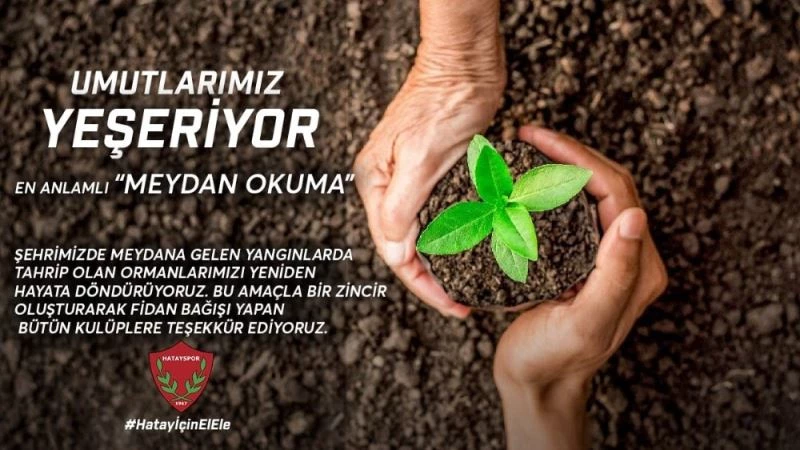 Hatay’ın Belen, Arsuz ve İskenderun ilçelerinde çıkan ve yerleşim yerlerine de sıçrayan orman yangınları sonrası, Türkiye’nin her yerinden Hatay’a destek yağdı. Destekler kapsamında başta Beşiktaş, Galatasaray, Fenerbahçe, Trabzonspor ve Başakşehir kulüpleri olmak üzere çok sayıda kulüp, fidan bağışında bulundu. ’Hatay İçin El Ele’ adı altında başlatılan fidan bağışlama kampanyası hakkında açıklamada bulunan Hatayspor Kulübü, "Bizim için daha anlamlı bir ’Meydan Okuma’ yok!" açıklamasında bulundu.