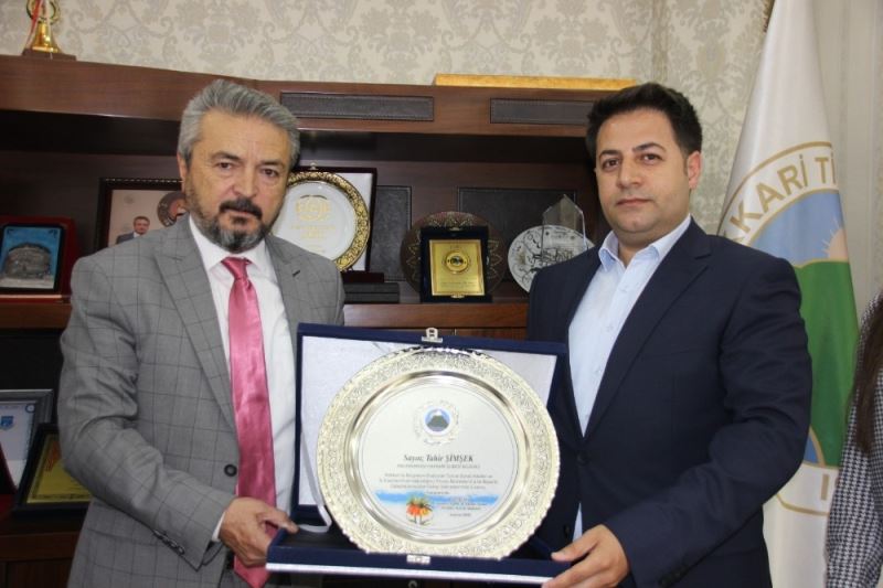 HATSO Başkanı Servet Taş, odayı ziyaret eden Halkbank Hakkari Şube Müdürü Tahir Şimşek’e plaket takdim etti.