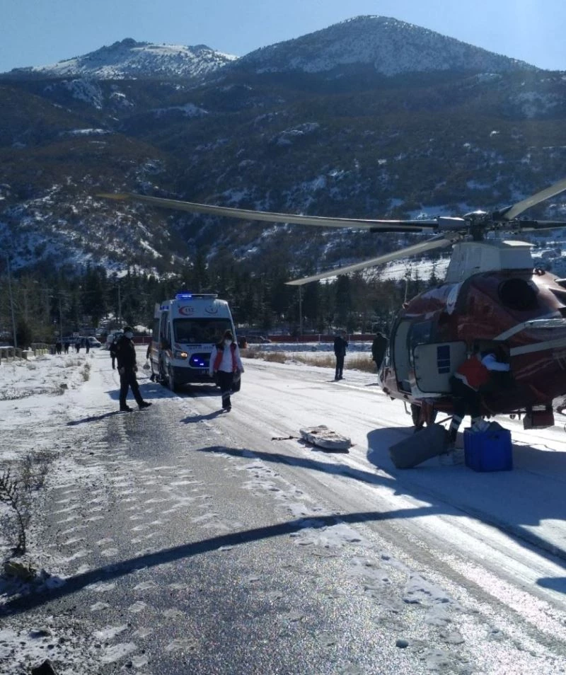 Afyonkarahisar’da düşme sonucu kalçası kırılan 78 yaşındaki adam, 112 Acil Servise ait hava (helikopter) ambulansı ile hastaneye kaldırıldı. Hava ambulansı, zorlu kış şartlarının hüküm sürdüğü Çay ilçesinde hastanenin önünde karla kaplanan yola inerek yaşlı adamı bir başka hastaneye sevk etti.