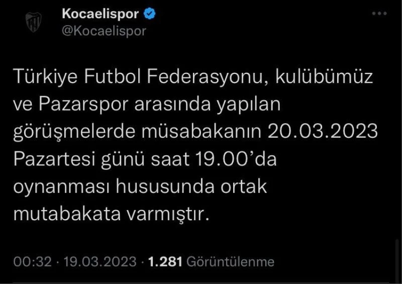 TFF 2. Lig Kırmızı Grup’ta bugün 14.00’da Kocaeli Stadyumu’nda oynanacak maç, Rize ekibi Pazarspor’un hava şartlarından dolayı gelememesi sebebiyle ertelendi. Müsabakanın Pazartesi akşamı 20.00’de oynanması konusunda kulüpler ve TFF arasında anlaşma sağlandı. Kocaelispor resmi sosyal medya hesabından yapılan açıklamada, “19.03.2023 Pazar günü saat 14.00’te Pazarspor ile oynayacağımız müsabaka öncesinde Pazarspor, elverişsiz hava şartlarından dolayı şehrimize gelememiştir. Türkiye Futbol Federasyonu, kulübümüz ve Pazarspor arasında yapılan görüşmelerde müsabakanın 20.03.2023 Pazartesi günü saat 19.00’da oynanması hususunda ortak mutabakata varmıştır” ifadelerine yer verildi.