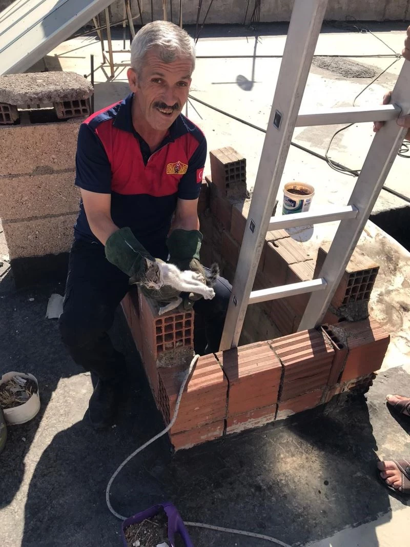 Adıyaman’da bir binanın havalandırma boşluğuna düşen yavru kedi, itfaiye ekiplerince kurtarıldı.