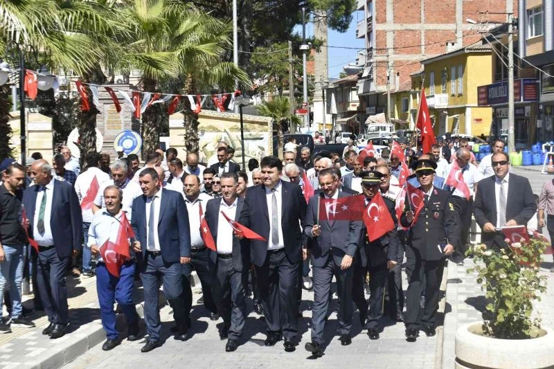 Kaymakamlık ve belediye başkanlığı çelenklerinin sunulması ve saygı duruşu, İstiklal Marşı’nın okunmasıyla başlayan tören daha sonra Askeri Bando eşliğinde kortej geçişi ile belediye binası önüne gelinerek devam etti.