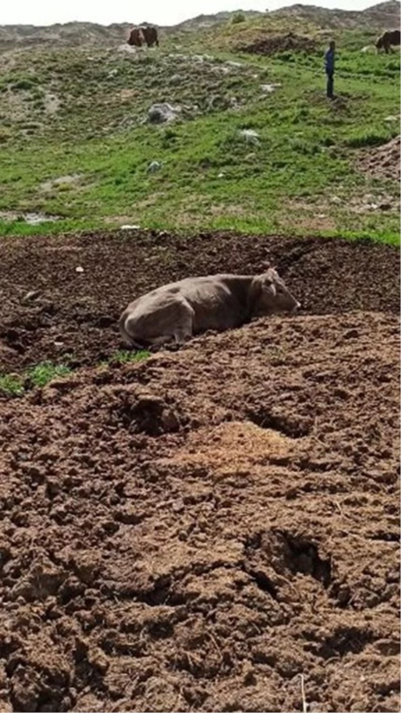 Sivas’ta hayvan dışkısına saplanan inek halatla çekilerek kurtarıldı.