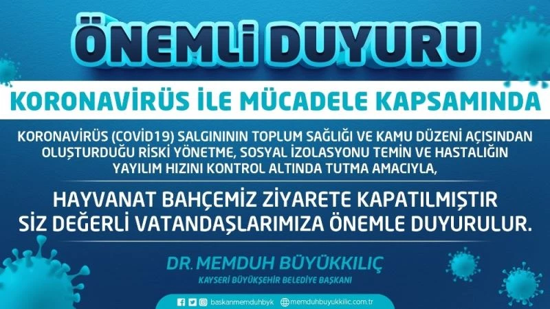 Kayseri Büyükşehir Belediyesi Anadolu Harikalar Diyarı Hayvanat Bahçesi, İçişleri Bakanlığı genelgesi doğrultusunda ziyarete kapatıldı.
