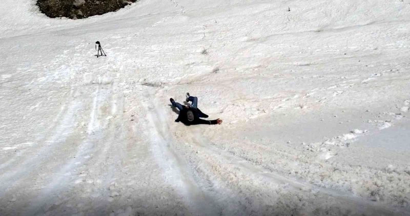 Erzincan kent merkezinde hava sıcaklığının 33 dereceyi bulduğu günde Munzur’da karla serinleyen vatandaşlar, poşetlerle kızak yapmayı da ihmal etmediler.