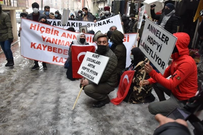 Çocukları terör örgütü PKK tarafından dağa kaçırılan ailelerin Diyarbakır’da başlattığı eylemin ardından Hakkari’deki aileler de üçüncü defa HDP il binası önünde eylem yaptı. Mukaddes Akar Sokağında bir araya gelen aileler, ellerinde Türk bayrakları ve değişik pankartlarla ‘Kürt-Türk kardeştir HDP kalleştir’, ’Çocuklarımız dağda kurda kuşa yem olmasın’, ‘Kahrolsun PKK’, ‘Kahrolsun HDP’ sloganları atarak HDP il binası önüne doğru yürüdü. Burada sloganlara devam eden ailelerin sesini bastırmak isteyen HDP’liler, hoparlörden partinin seçim müziklerini ve Selahattin Demirtaş’ın bestelediği “Korkma Bağır” adlı şarkıyı çaldırdı. Bunun üzerine anneler de seslerini daha gür ulaştırmak için megafonla slogan atmaya devam etti.