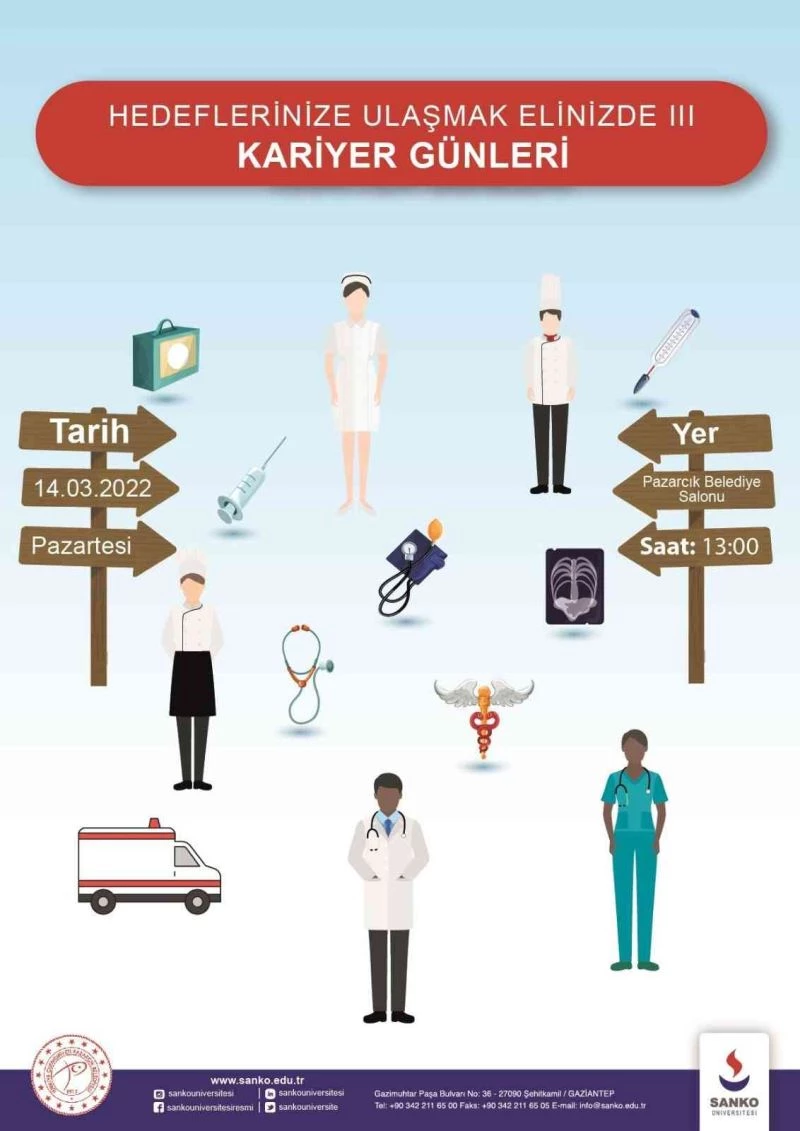 SANKO Üniversitesi akademisyenleri “Hedeflerinize Ulaşmak Elinizde” konulu kariyer günü nedeniyle 14 Mart 2022 tarihinde Pazarcık’ta eğitimciler ve öğrencilerle buluşacak.