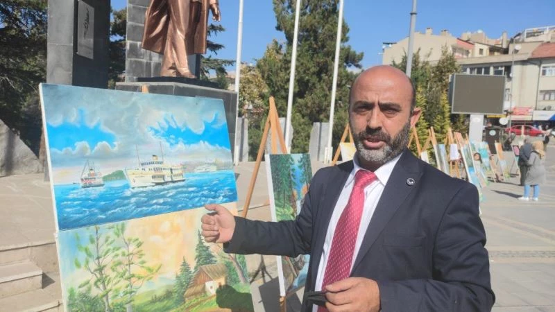 Kayseri’nin Develi ilçesinde Yazıbaşı Mahallesi Cami İmam Hatibi Süleyman Yücel, 2017 yılından bu yana çizdiği resimleri, ilçe meydanında sergiledi.
