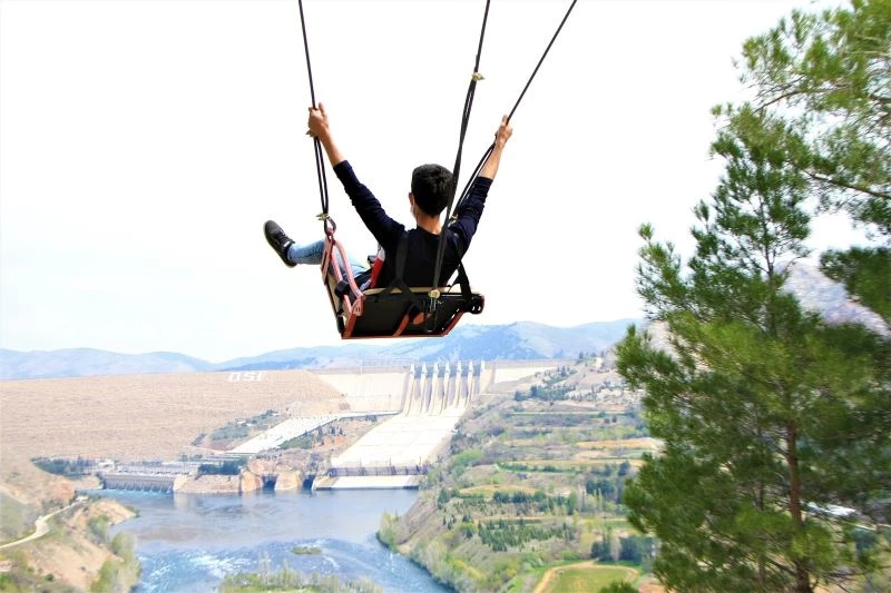 Elazığ’daki Keban Baraj gölü kıyısındaki yüksek bir tepeye kurulan dev salıncak hem korku, hem de keyif verirken, kısıtlamanın kaldırılmasıyla bayramdan sonra hizmete açılacağı belirtildi.