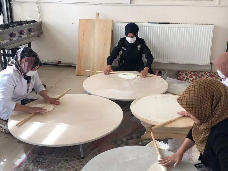 Sivas’ta kadın polis memuru KADES uygulamasını tanıtmak için bir araya geldiği kadınlarla birlikte hamur yoğurup yufka açtı, dikkat çeken kadın dayanışması yürek ısıtan görüntüler oluşturdu.
