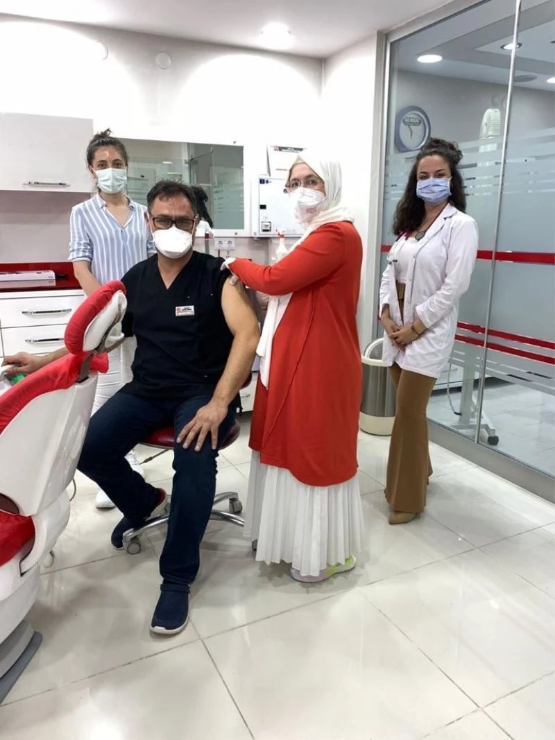 Ordu’da Toplum Sağlığı Merkezi’nde görevli hemşire Saliha Aybastı, diş hekimi olan eşine "yerinde aşı" yaptı.