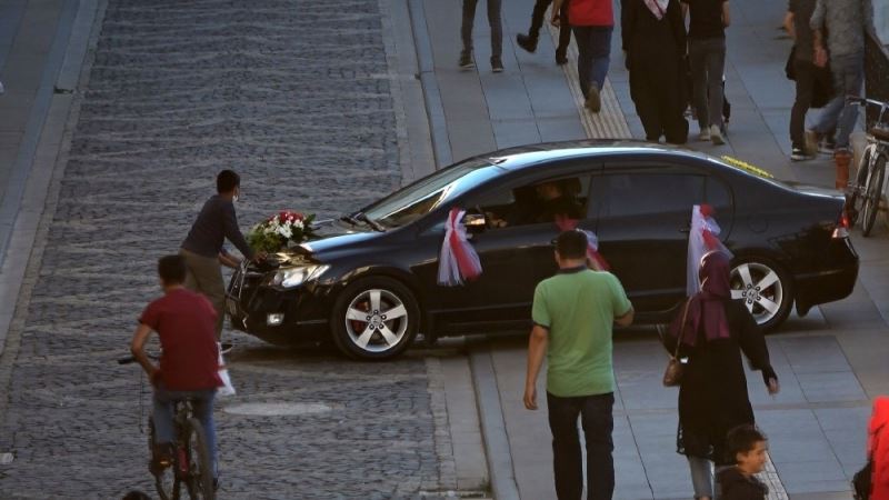 Sivas’ta her türlü tehlikeyi göze alıp gelin arabasının önünü kesen iki çocuk, zarfı alana kadar aracın önünden çekilmedi, korkuyu izleyenler ve araçtakiler yaşadı.