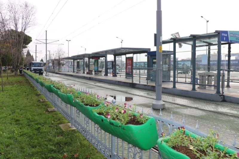 Büyükşehir ekipleri, kent genelindeki tramvay duraklarında yer alan korkuluklar için özel saksılar tasarladı. Görsel güzelliği arttırmak için yapılan çalışmayla saksılara hercai menekşe dikimi yapıldı. Hercai menekşeler renkleri ve görüntüsüyle duraklara renk kattı.