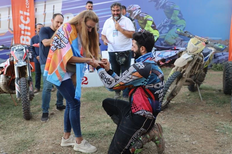Kocaeli’nin Kartepe ilçesinde düzenlenen Türkiye Enduro ve ATV Şampiyonası ikinci ayak yarışlarında şampiyon olan sporcu, kürsüde sürpriz yaparak kız arkadaşına evlilik teklifi yaptı. Genç sporcu, “Evet” cevabını aldığı kız arkadaşına kalabalığın alkışları eşliğinde yüzüğünü taktı.