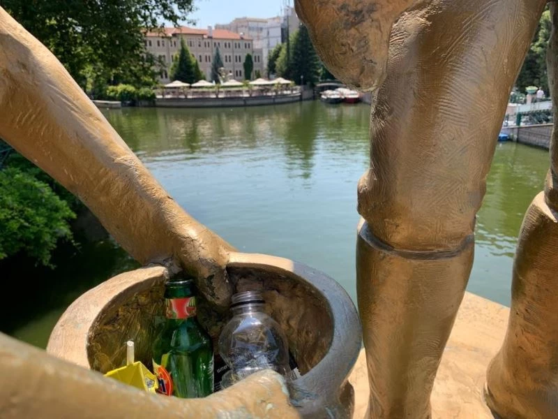 Eskişehir’in önemli turizm simgelerinden olan Porsuk Çayı köprüsünde yer alan balıkçı heykeli, sorumsuz vatandaşlar tarafından çöp kovası olarak kullanılıyor.