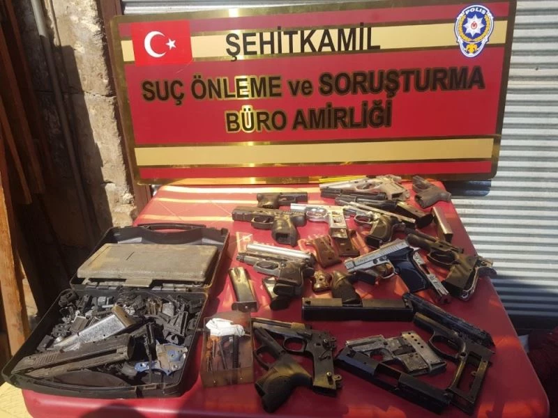 Şehitkamil İlçe Emniyet Müdürlüğü ekipleri ilçe merkezinde yaşanan 4 ayrı hırsızlık olayının faili S.S.K. isimli şahsın Boyacı Mahallesi’nde bir işyerinde olduğunu tespit etti. Şahsı yakalamak için işyerine operasyon düzenleyen ekipler zanlıyı işyerinde kaçak silah imal ederken yakaladı. İşyerini arayan ekipler, 7 adet tabanca 5 adet kurusıkı tabanca, çok sayıda tabanca malzemeleri ve kurusıkı tabancayı gerçek tabancaya çevirmeye yarayan aparatlar ele geçirdi. Operasyonda yakalanan 2 şüpheli şahıs hakkında yasal işlem başlatıldı.