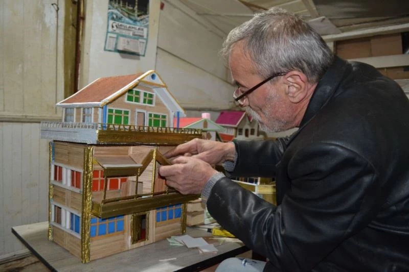 Maket ev yaparken zamanın nasıl geçtiğini anlayamadığını belirten Yıldız, “Emekli olduktan sonra boşlukta kalmamak için evimin yanındaki depoyu atölyeye dönüştürdüm. Burada sağdan soldan inşaatlardan bulduğum malzemelerle maket yapmaya başladım. Sunta, tahta çay karıştırıcıları, kibrit çöpleri, köpüklerden faydalandım. Başka tülü zaman geçmediği için bunlarla zamanımı değerlendirdim” dedi.