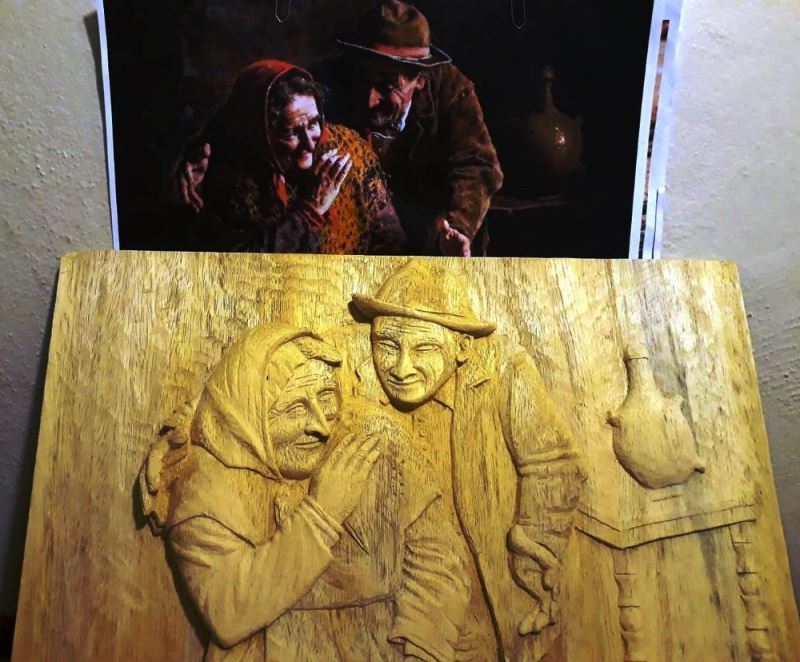 Hüseyin Karapınar, ahşap oymacılığını 1980’li yıllardan beri hobi olarak yaptığını belirterek, "İlk önce maket bıçağıyla küçük küçük kuşkanatları, küçük atlar, kartal heykelcik yontarak başladım. Daha sonraları alet edevat çoğalmaya başladı. Tabi ki işlerin boyutları da büyümeye başladı. 40-50 cm’lik heykelcikler, 35x50 cm’lik rölyef tablolar yapmaya başladım, halen de devam etmekteyim. Yaklaşık 35 senedir amatörce heykelcikler ve rölyef tablolar yapmaktayım, bu iş içinde evimin bir odasını kullanmaktayım” dedi.