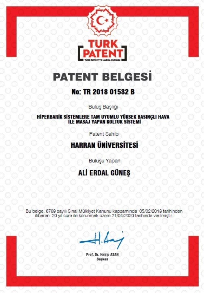 Harran Üniversitesi ve sanayiciler arasında YÖK ve Sanayi Bakanlığı’nın destekleriyle farklı alanlarda iş birliği çalışmaları yapılmaya başlanmıştı. Üniversite, akademik bilgi birikimini sanayi ve üretime aktarmanın adımlarından olan patent başvurusunun sonuçlarını almaya başladı. HRÜ Tıp Fakültesi Sualtı Hekimliği ve Hiperbarik Tıp Anabilim Dalı Dr. Öğretim Üyesi Ali Erdal Güneş basınç odasında tedavi gören bacak ve ayaklarda dolaşım bozukluğu olan hastalar için geliştirdiği koltuk sistemi, üniversite proje pazarında beğenildikten sonra Teknoloji Transfer Ofisi destekleriyle ‘Hiperbarik Sistemlere Tam Uyumlu Yüksek Basınçlı Hava ile Masaj Yapan Koltuk Sistemi’ isimli patent onay belgesini aldı. Harran Üniversitesi’nin akademik birikimini sanayiye ve üretime destek olmak amacıyla ülkemizde marka konumuna getirmeye çalıştıklarını vurgulayan Dr. Güneş, "Yapılan çalışmalarda hiperbarik oksijen tedavisi alan hastaların yaklaşık yüzde 40’ı dolaşım bozuklukları olan hastalardan oluşmaktadır. Buluşumuz ile özellikle dolaşım bozukluğu olan ve hiperbarik oksijen tedavisinden faydalanma oranı az olan hastalarda başarısını arttıracaktır. Patent başvuru süresinden onay alınmasına kadar geçen süre yaklaşık üç yıl. Bu süre içerisinde desteğini yanımızda hissettiğimiz Rektörümüz Prof. Dr. Mehmet Sabri Çelik’e, Harran Üniversitesi Rektör Yardımcısı ve Teknokent Genel Müdürü Prof. Dr. Mehmet Hançer’e ve Bilimsel Araştırma Proje koordinatörlüğüne teşekkürlerimi sunarım” dedi.