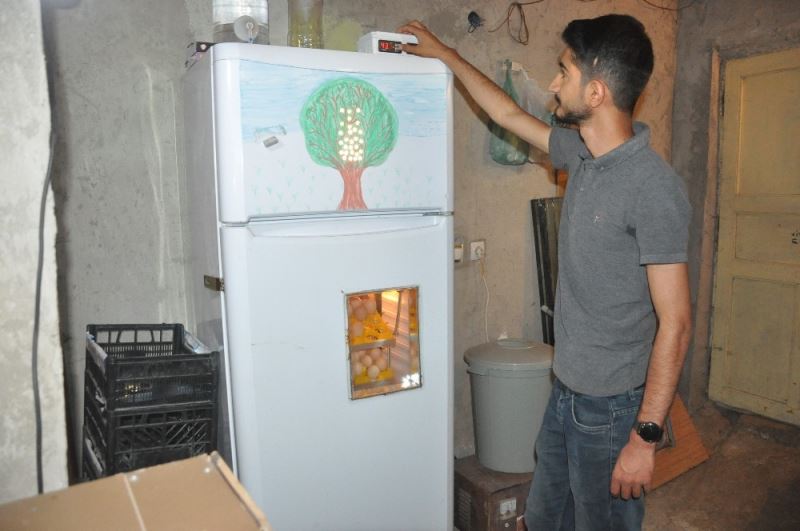 Hakkari’nin Yüksekova ilçesinde yaşayan Hazım Bartın, hurdacıdan aldığı buzdolabından yaptırdığı kuluçka makinesiyle ayda 324 civciv üretiyor.