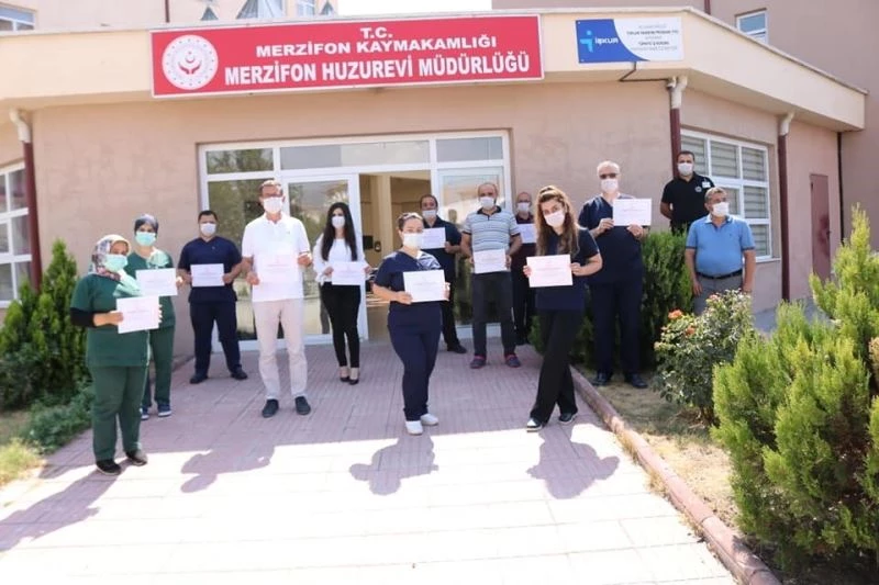 Merzifon Huzurevi personelleri, korona virüs (Kovid-19) pandemisi dolayısıyla 2020 Nisan ayından beri mesailerine 14’er günlük vardiya şeklinde Kovid-19 testi yaptırarak başladı. 14 gün hiç evlerine gitmeden İrfanlı Anadolu Lisesinin öğrenci yurdunda kalan personelleri takdir eden Amasya Aile, Çalışma ve Sosyal Hizmetler İl Müdürü Ahmet Kurt, personelleri teşekkür belgesi ile onurlandırdı.