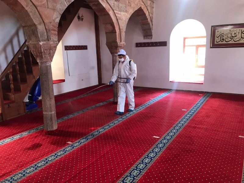 İlçedeki tüm ibadethanelerin düzenli olarak temizliği yapan belediye ekipleri, ilaçlama çalışmalarını da yaparak ibadethanelerin sterilizasyon işlemleri tamamlıyor.