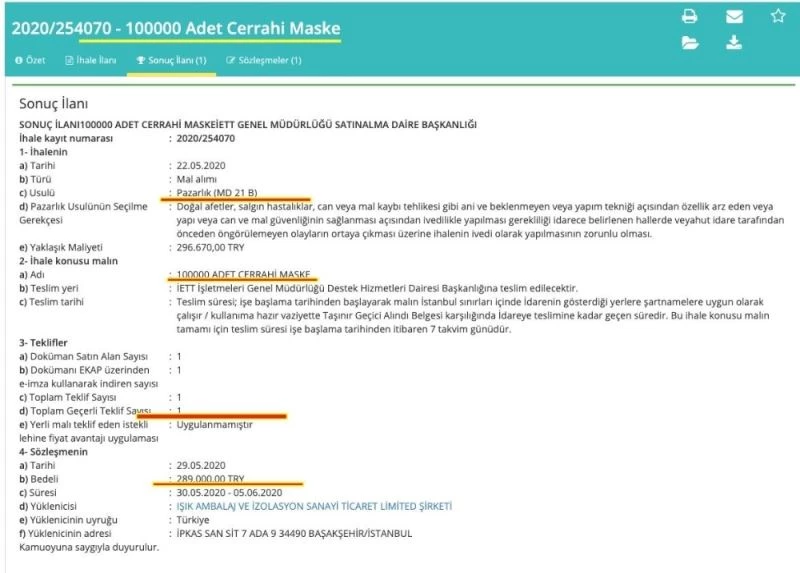 İstanbul Büyükşehir Belediyesi (İBB) İETT için açılan ihaleye 100 bin adet cerrahi maske satın aldı. Ancak yapılan ihalede CHP’li Hülya Sarıgöl’ün firmasına tavan fiyatı 1 TL olarak belirlenen maskeler için 2.89 TL ödendiği ortaya çıktı. Buna göre firmaya 100 bin adet maske için 289 bin TL lik sözleşme yapıldı. Skandal ihale, sosyal medyada vatandaşların da tepkisini çekti.