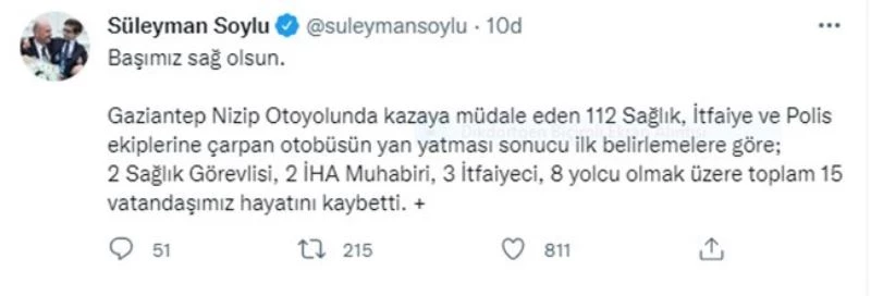 İçişleri Bakanı Süleyman Soylu, Gaziantep Nizip Otoyolundaki kazaya ilişkin olarak, "2 sağlık görevlisi, 2 İHA muhabiri, 3 itfaiyeci, 8 yolcu olmak üzere toplam 15 vatandaşımız hayatını kaybetti" dedi.