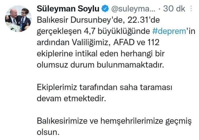 İçişleri Bakanı Süleyman Soylu, 4,7 büyüklüğündeki depremin meydana geldiği Balıkesir’e geçmiş olsun dileklerini ileterek, deprem bölgesinde herhangi bir olumsuzluk yaşanmadığını duyurdu.