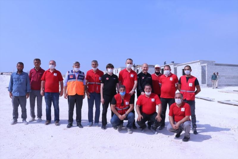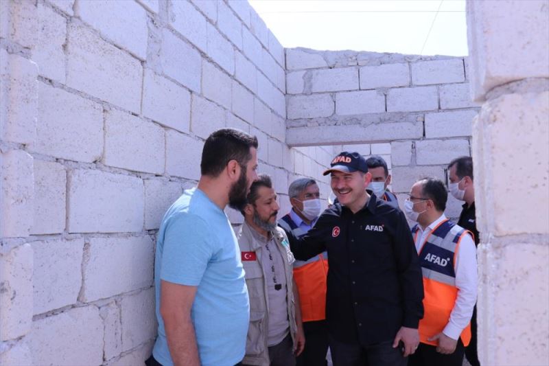 AFAD öncülügünde, Esed rejimi ve destekçilerinin saldirilarindan kaçan siviller için burada yapilan briket evleri inceleyen Soylu, insani yardim çalismalari hakkinda bilgi aldi.