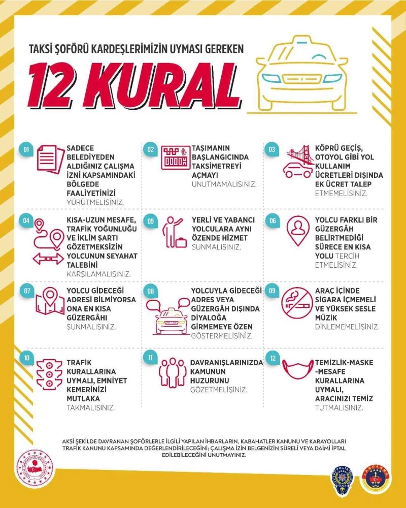 İçişleri Bakanlığı tarafından son dönemde taksilerle ilgili yaşanan sıkıntılar nedeniyle taksi şoförlerinin uyması gereken 12 kuralın yazılı olduğu bir görsel hazırlanarak, 81 il valiliğine gönderildi. Görseller, ülke genelinde taksi duraklarına, taksi bekleme yerlerine ve yolcuların görebileceği diğer yerler ile taksilerde de yolcuların görebileceği uygun alanlarda bulundurulacak. İçişleri Bakanlığı tarafından farkındalığın, caydırıcılığın ve denetimlerin etkinliğinin artırılması hedeflenen görselde şu uyarılar yer aldı:
