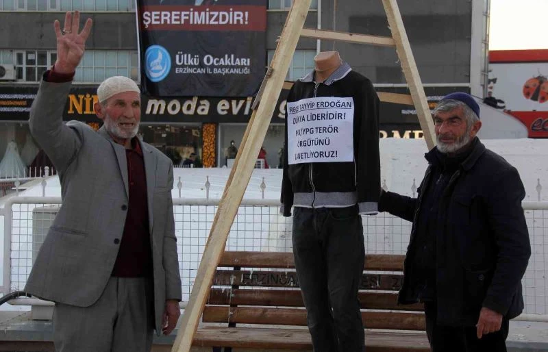 İsveç’te terör örgütü yandaşlarının, Cumhurbaşkanı Erdoğan’a karşı yaptıkları saldırıya Erzincan’da iki yaşlı adam kayıtsız kalmayarak sert tepki gösterdi. Fahri Sarıgöl ile Mehmet Baytekin isimli vatandaşlar, hazırladıkları idam sehpasını Dörtyol Meydanına getirerek burada maketi astılar. İsveç’te yapılan saldırıya tepki gösterip Cumhurbaşkanı Erdoğan’ın sonuna kadar destekçisi olduklarını ifade eden Sarıgöl ile Baytekin, 85 milyon Türk halkının devlet başkanının yanında olduğunu kaydettiler.