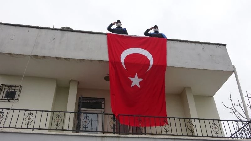 Suriye’nin İdlib bölgesinde sözleşmeli er olarak görev yapan Ramazan Erdoğan, Adıyaman İl Emniyet Müdürlüğüne ulaşarak Adıyaman merkez Karapınar Mahallesi’nde bulunan evlerine Türk bayrağı asılmasını istedi. 3 yıldır sözleşmeli er olarak görev Ramazan Erdoğan’ın isteği üzerine harekete geçen Adıyaman İl Emniyet Müdürlüğüne bağlı Toplum Destekli Şube Müdürlüğü ekipleri, 3 metre boyundaki Türk bayrağını Erdoğan’ın evine götürdü. Polis ekipleri Türk bayrağını Ramazan Erdoğan’ın annesi Üveys Erdoğan’a teslim etti. Polis ekipleri teslim ettikleri bayrağı Erdoğan Ailesi ile birlikte eve asarak dalgalandırdı.