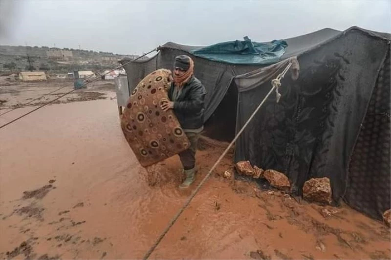 Suriye’nin kuzeyinde İdlib kırsalında bulunan Kafr Aruq köyündeki mülteci kampı, şiddetli yağışlar nedeniyle sular altına kaldı. Kafr Aruq’ta bulunan 470 mülteci çadırı yağışlar nedeniyle büyük zarar gördü. Kampta bulunan 80 çadır kullanılmaz hale geldi. Çadırların kullanılmaz hale gelmesiyle kampta yaşayan birkaç aile daha küçük bir çadıra birlikte sığınmak zorunda kaldı.
