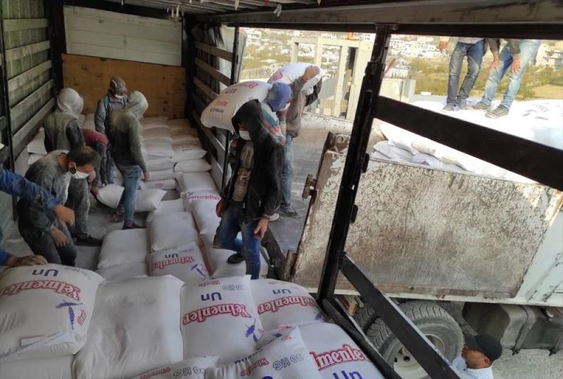 Burada Suriye'den gelen araçlara yüklenen yardımlar, İdlib kırsalındaki çadır kentlerde kalan ailelere dağıtıldı.